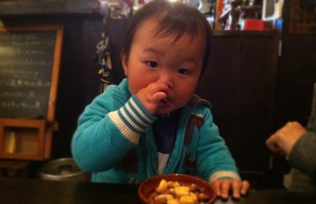 ジャイアントコーンを頬張る1歳児。